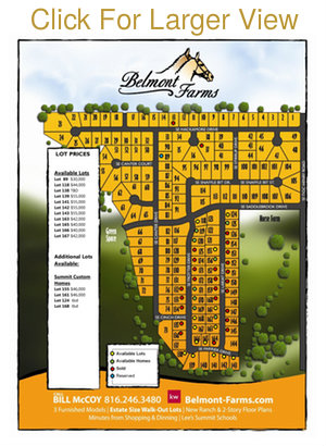 Belmont Farms is located in south Lee’s Summit, near 291 highway and 150 highway in the award winning R-7 Lee’s Summit school district. Students attend Trailridge Elementary, Summit Lakes Middle School and Lee’s Summit West high school. The large estate sized lots are tucked away in this beautiful, quiet community but just minutes from shopping, dining and highway access. Our award winning builders are offering a variety of floor plans, many new to the area. Come enjoy affordable estate living at Belmont Farms!